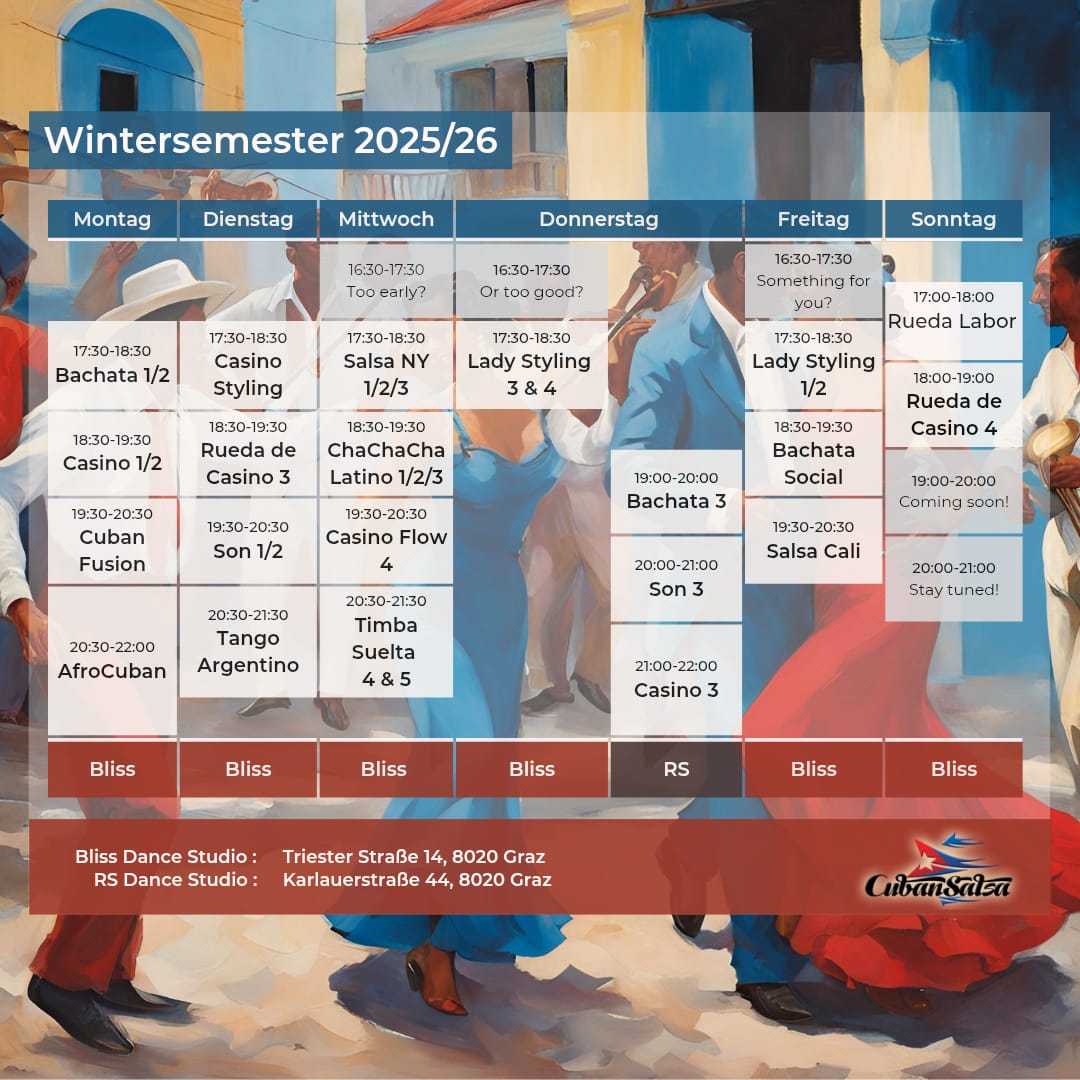 | Sa, 17.01.2026 | Bliss Dance Studio | 18:00 - 19:30 | Salsa Cali | alle Levels |